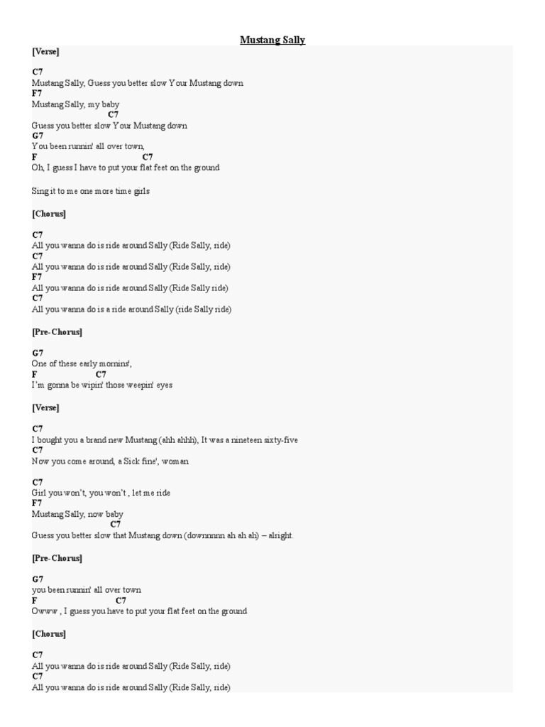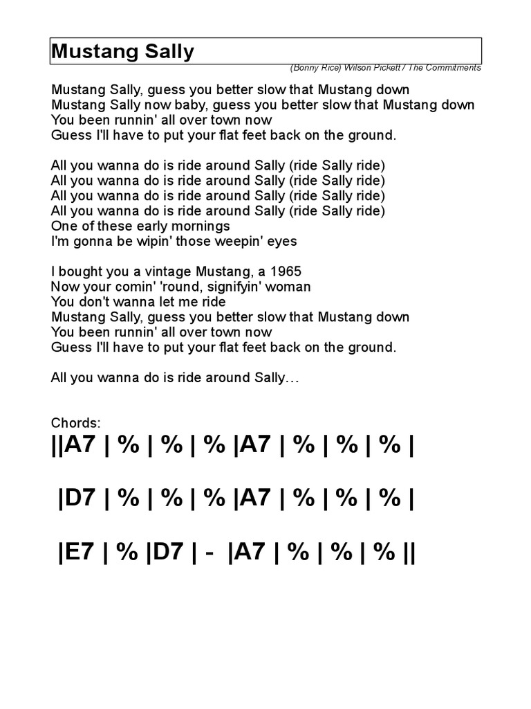 Mustang Sally (Wilson Pickett) Guitar Chord Chart | Music theory guitar, Guitar chords and lyrics, Great song lyrics