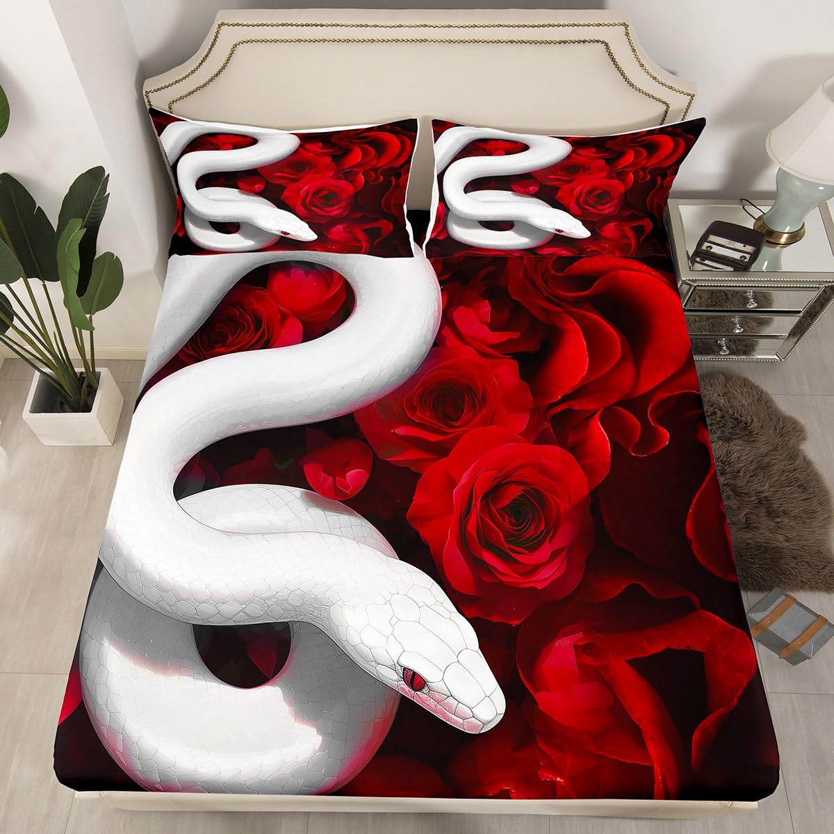 Sábanas de serpiente blanca 3D, sábanas de animales de selva de safari africano, sábana bajera ajustable de flores de rosa roja tamaño Queen para ...