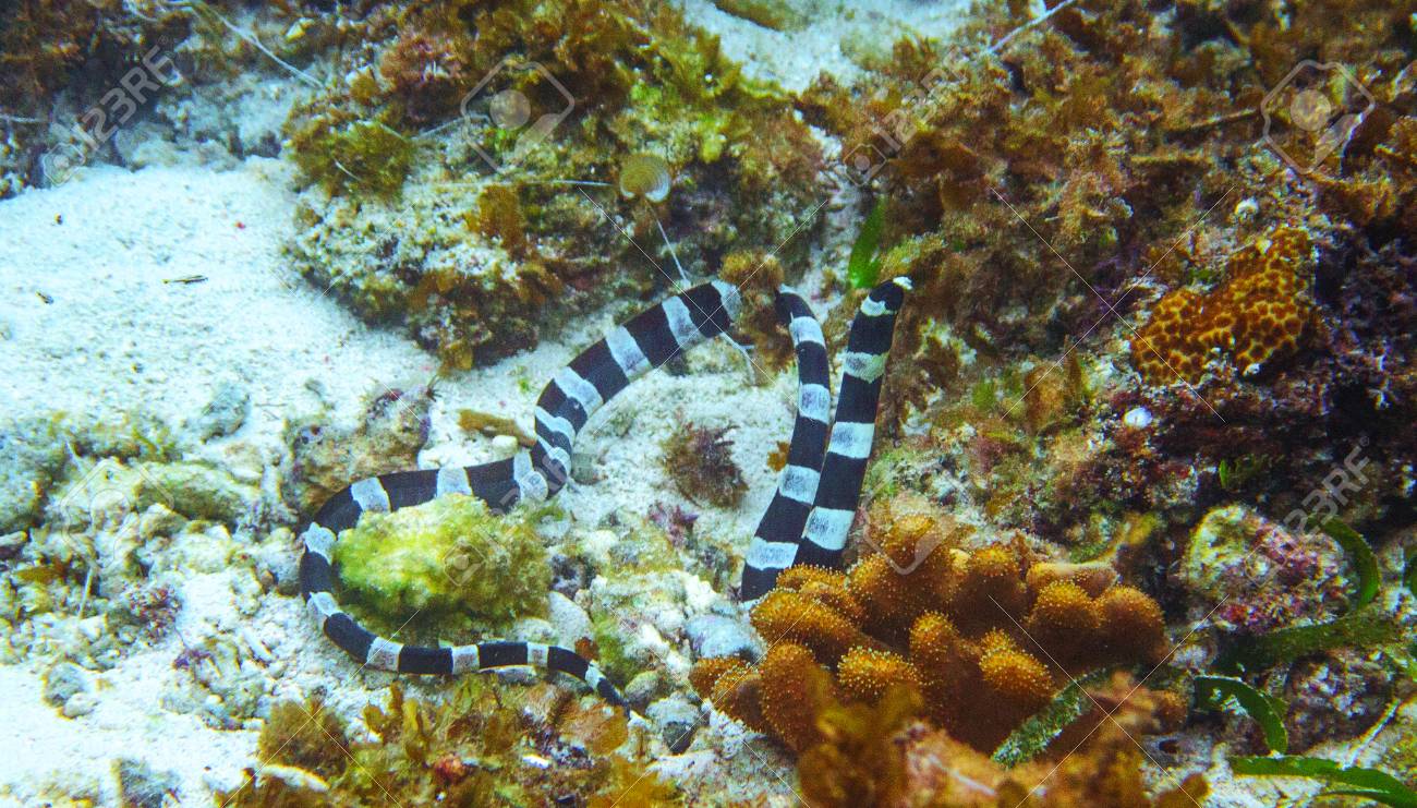Foto Subacuática De La Serpiente De Mar Blanco Y Negro. Peligroso ...