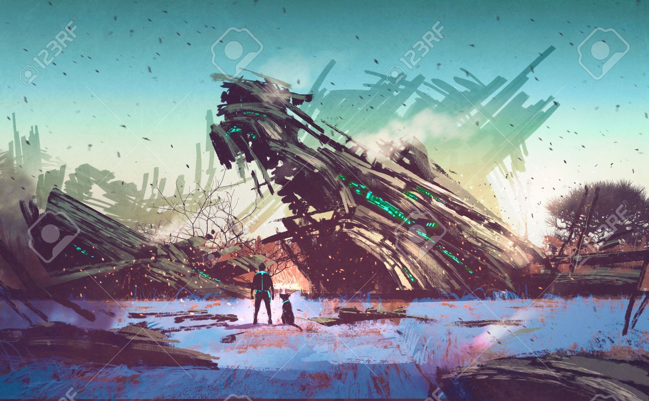 Nave Espacial Se Estrelló En Campo Azul, Ilustración Pintura Fotos ...