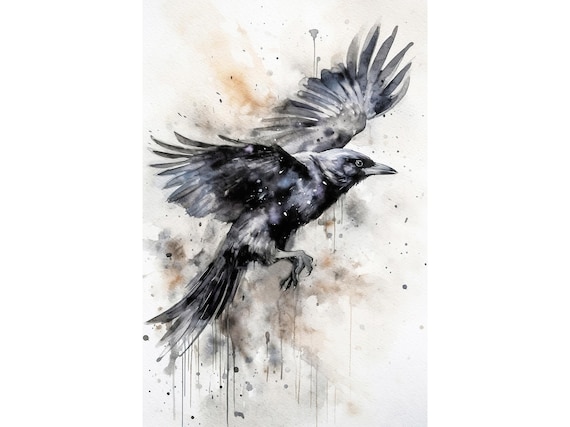 Pintura de acuarela de cuervo, impresión artística de cuervo negro ...