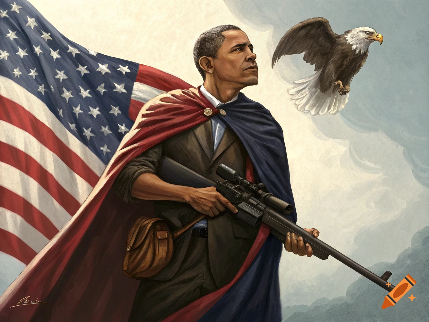Illustration of Barack Obama in a cape and suit holding a rifle ...