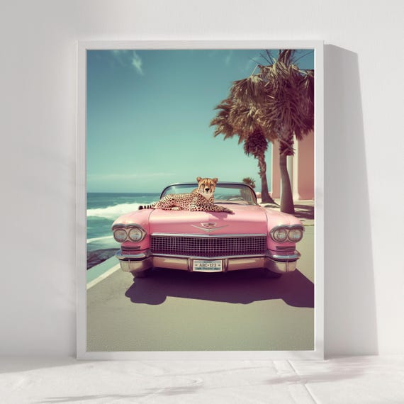 Lámina artística de coche rosa guepardo: decoración de pared retro ...