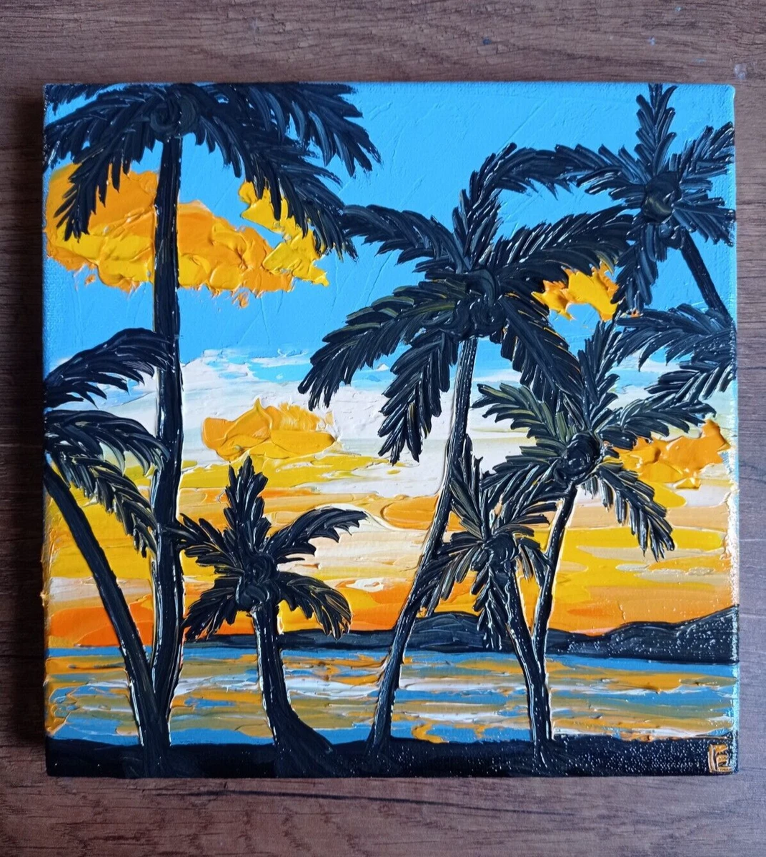 Pintura original Puesta de sol Arte Playa tropical Palmeras Aceite Paisaje... | eBay