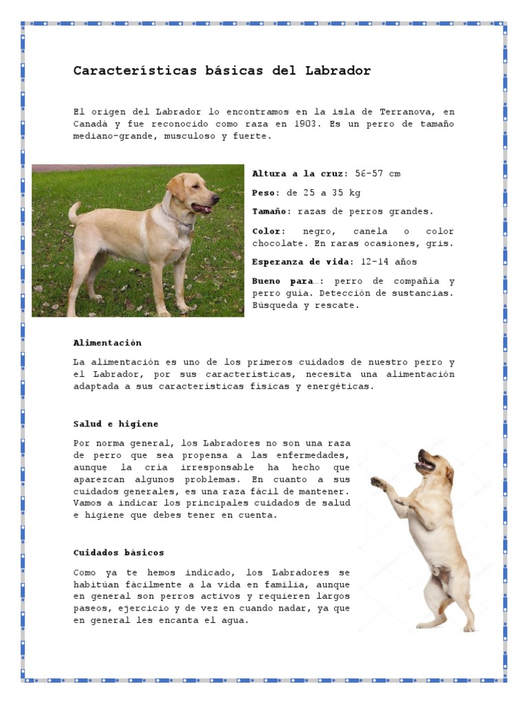 El labrador retriever (conocido también como cobrador de Labrador o perdiguero de Labrador)es una raza canina originaria de Terranova, en la actual Canadá. Es una de las razas más populares del mundo ...