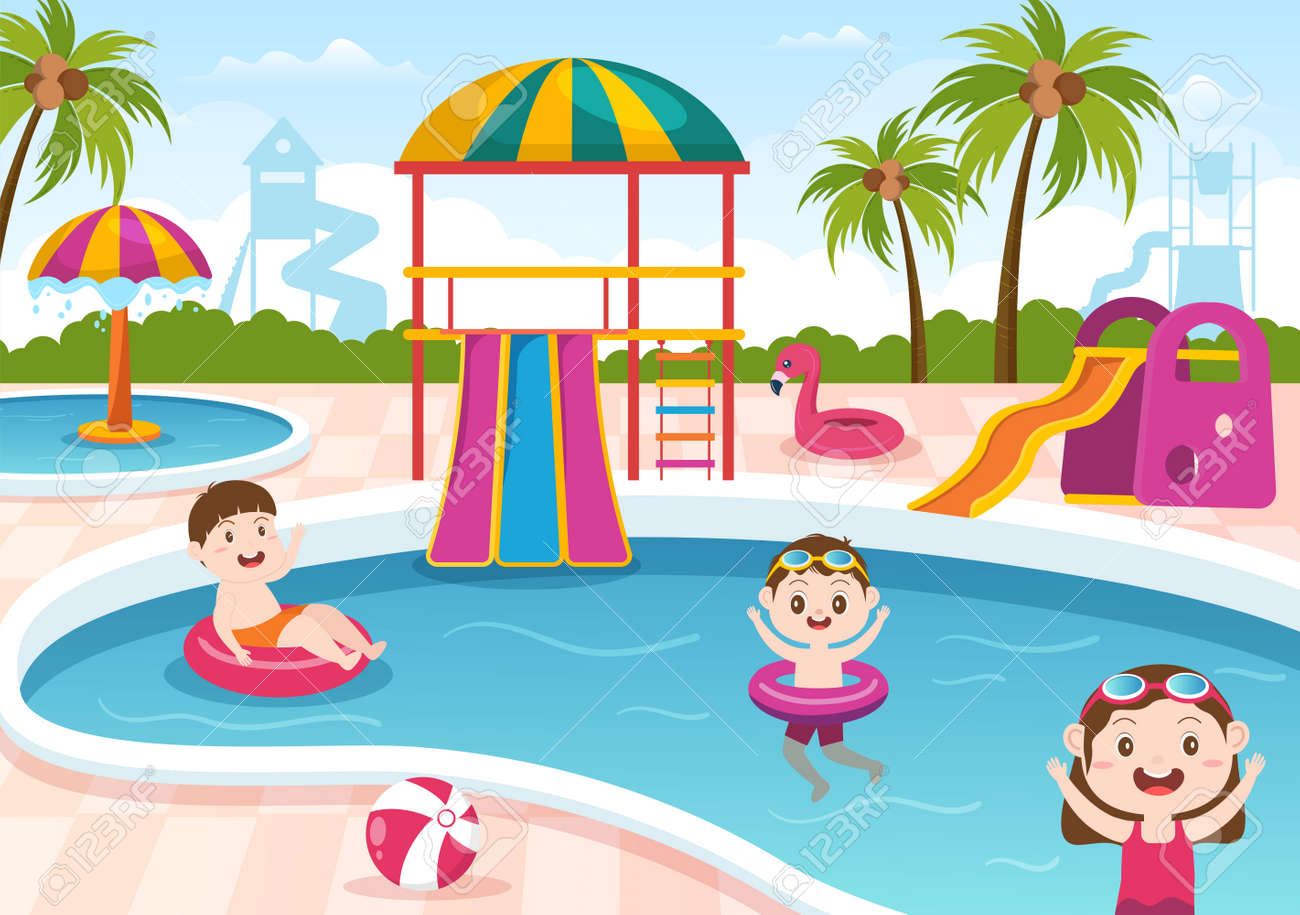 Vacaciones De Verano Piscina Para Niños Jugando Dibujos Animados ...