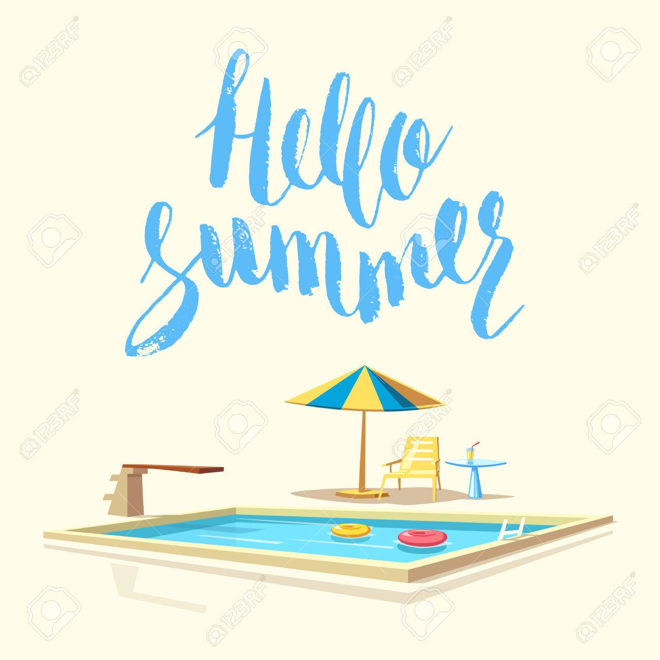 Hola Verano. Piscina. Ilustración De Dibujos Animados Vector ...