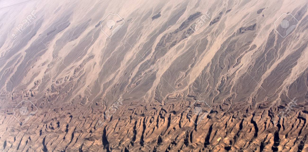Desierto Con Terreno Rugoso Marrón Y Dunas De Arena De Barchan Del Vuelo Del Avión Sobre Fondo Natural, Geología Y Concepto Geográfico Fotos, retratos, imágenes y fotografía de archivo libres de derecho.
