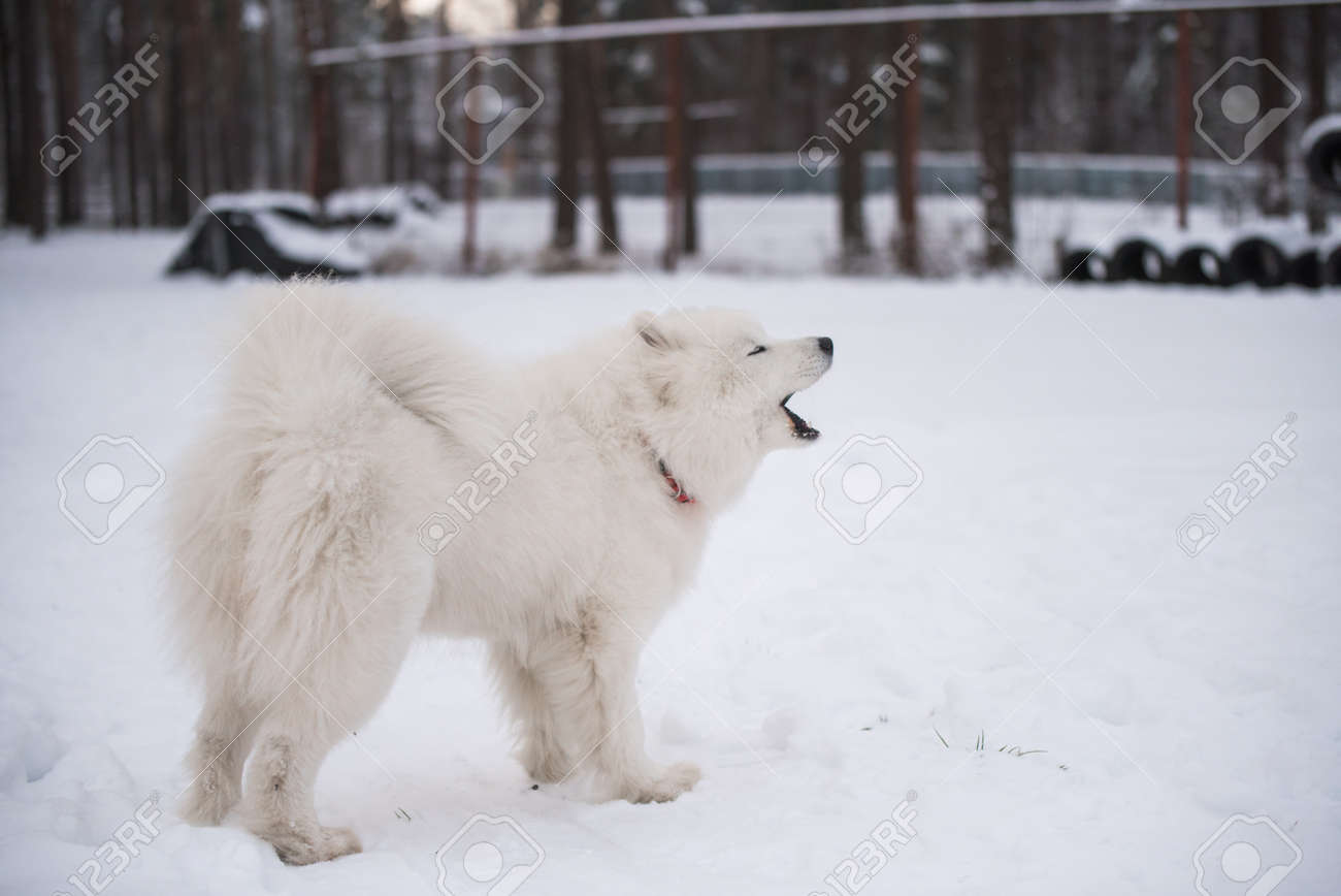 Lindo Perro Samoyedo En El Parque El Día De Invierno Fotos ...