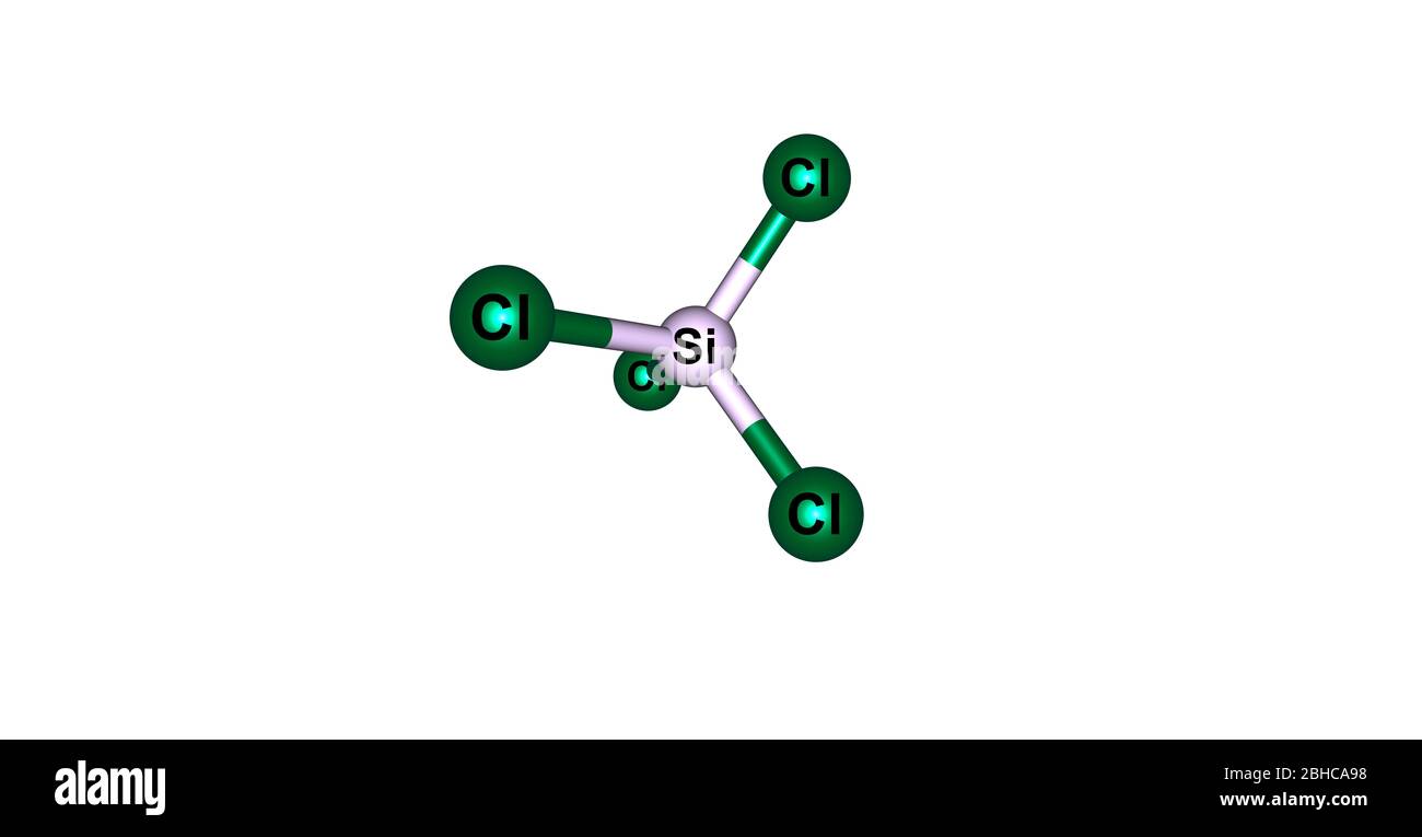 Silicon tetrachloride or tetrachlorosilane or Silicon (IV) chloride. Formula SiCl4 or Cl4Si. 3D render. Seamless loop. Chemical structure model: Ball and Stick. White background