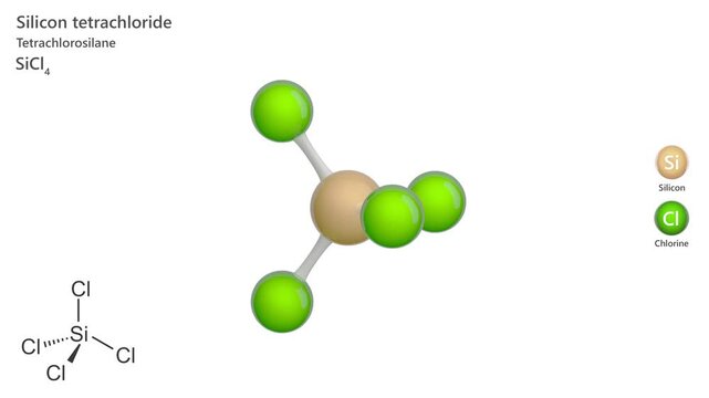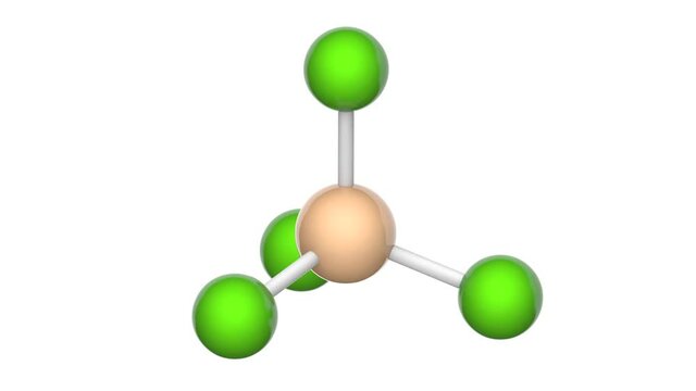Silicon Tetrachloride. Animated 3D model of a molecule. Molecular formula: SiCl4. Chemical model: Ball and sticks. White background. 3D rendering. Seamless loop.