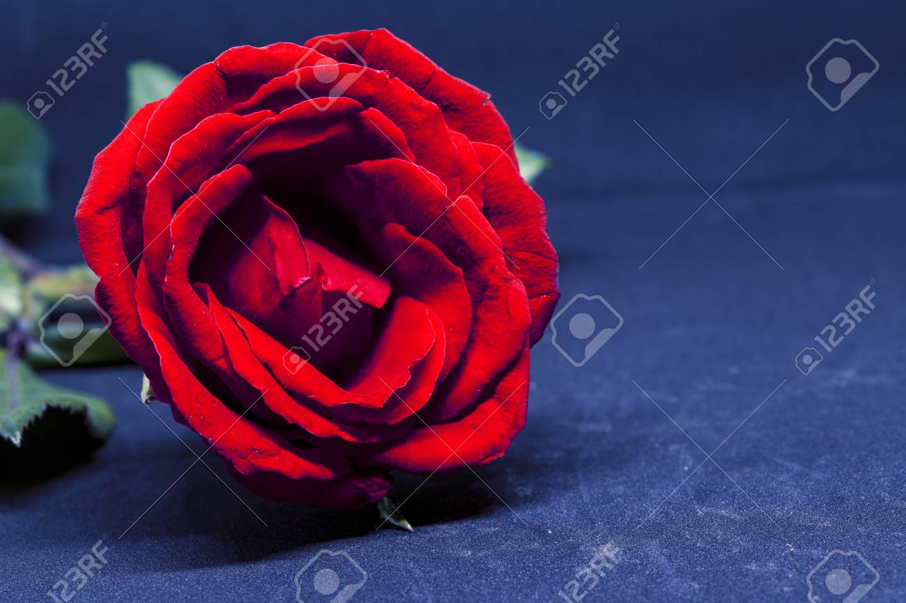 Rosa Roja Sobre Fondo Azul. Hermosa Flor Con Pétalo De Terciopelo ...