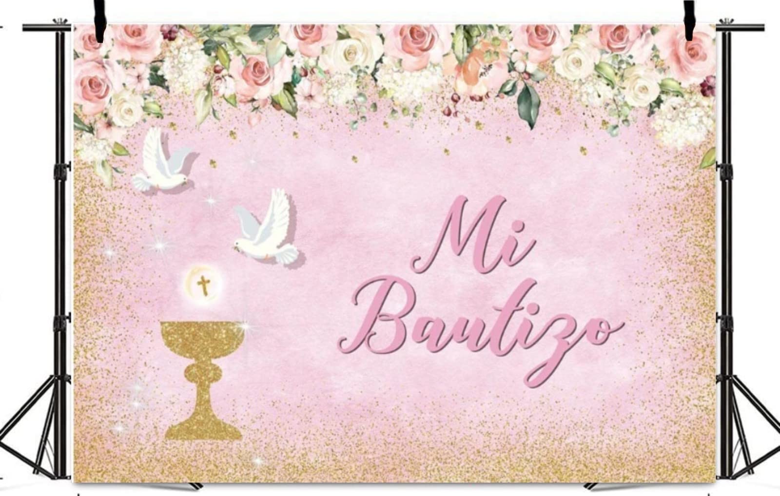Allenjoy Telón de fondo de bautismo floral rosa y dorado de 82 x 59 pulgadas para bebé niña española Mi Bautizo Butterfly Pigeon 1er cumpleaños ...