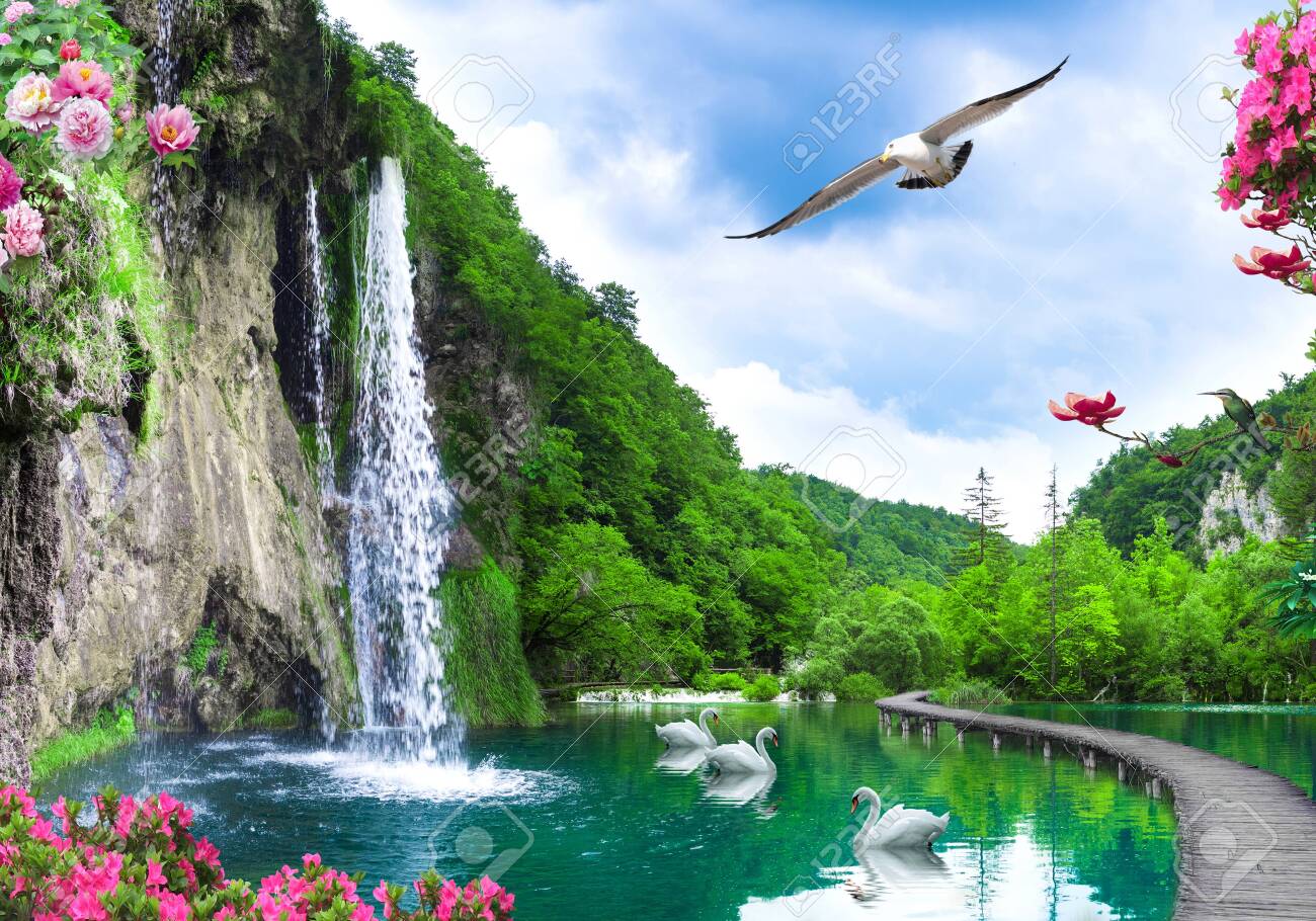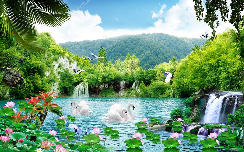 Fondo Pantalla Ilustración Cascadas Naturaleza Lago Hermoso Bosque ...