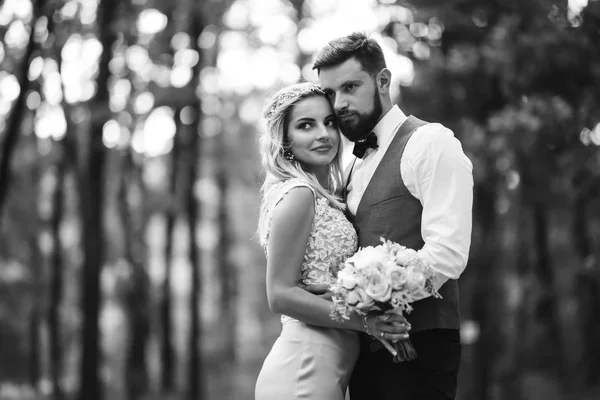 Retrato Blanco Negro Una Hermosa Pareja Novios Parque Día Boda ...