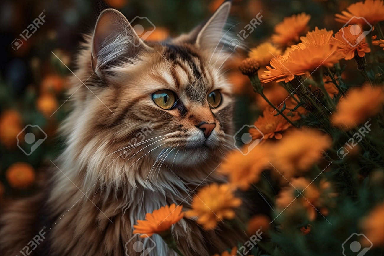 Retrato De Gato Siberiano Con Flores Naranjas En El Jardín Fotos ...