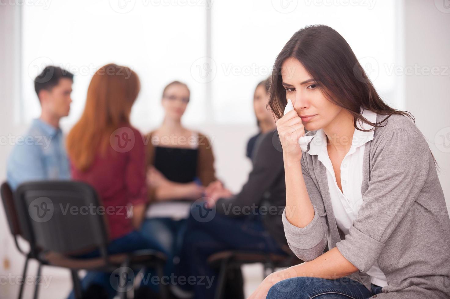 Mujer Triste Llorando En Una Reunión De Terapia Frente A Un Grupo ...