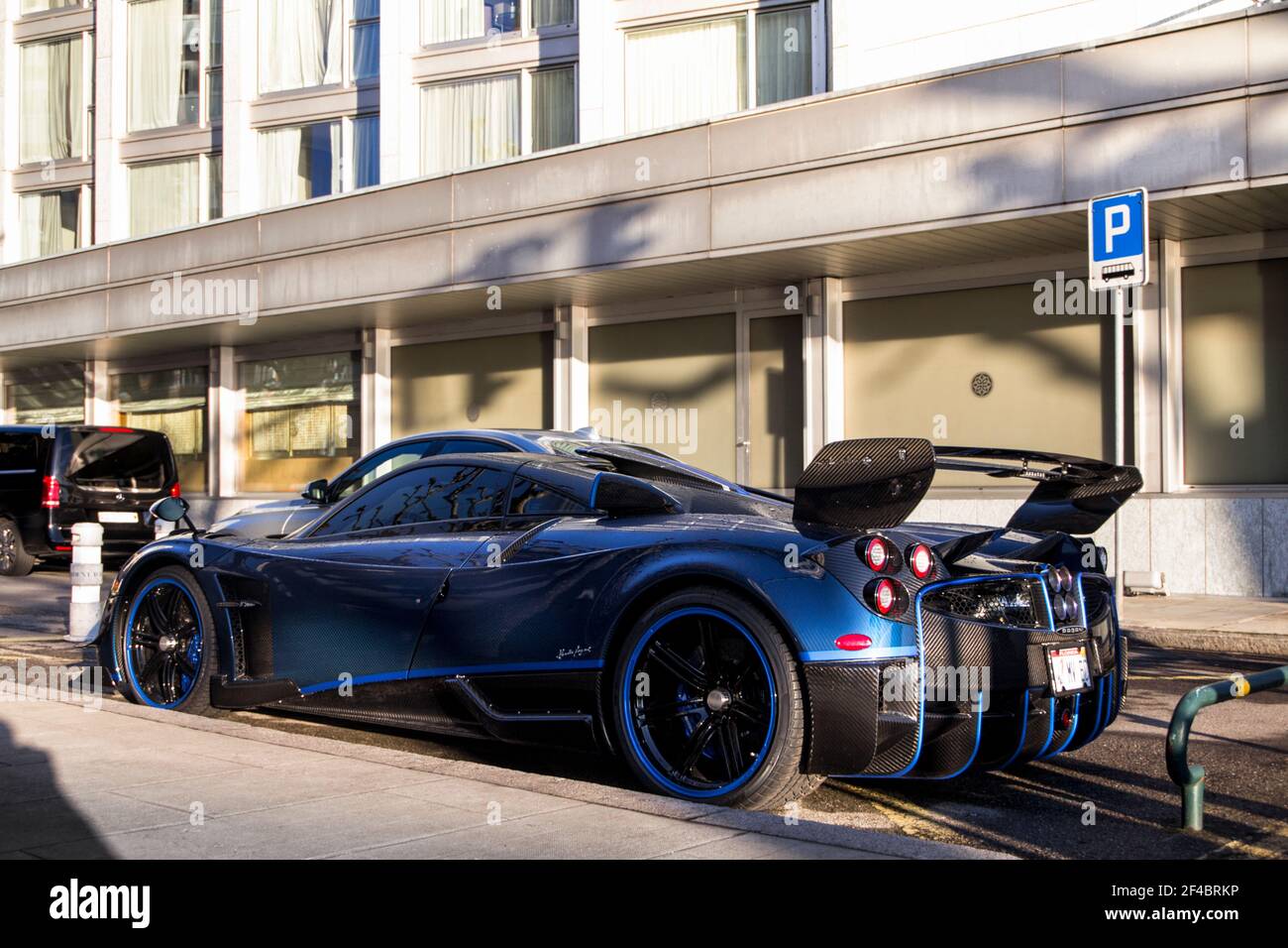 Blue carbon fiber Pagani Huayra BC "Macchina Volante" unique modern supercar parked at a luxury hotel in central Geneva, Switzerland Stock Photo - Alamy