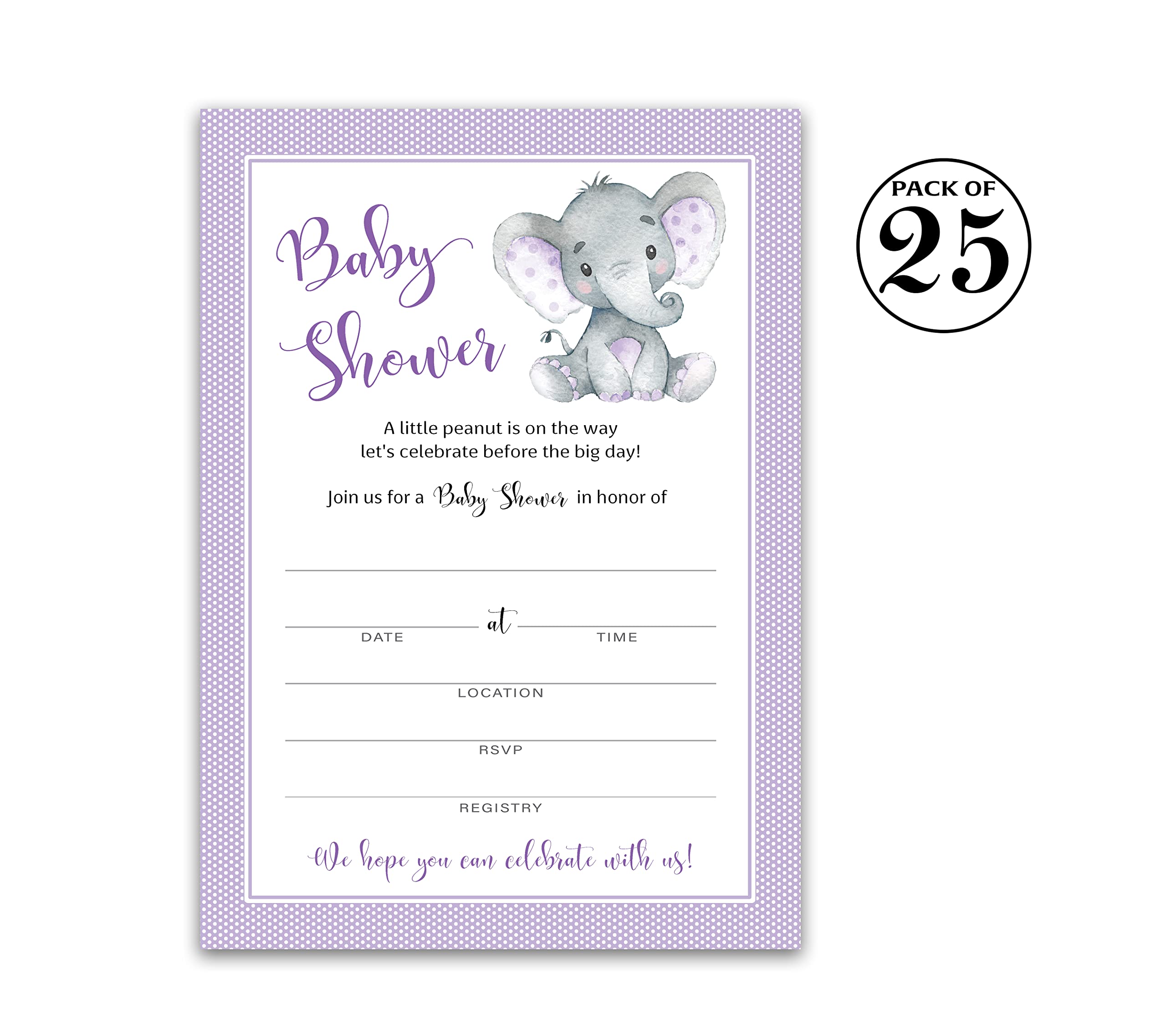 Invitaciones para baby shower de elefante morado neutro de género, paquete de 25 unidades, relleno en blanco para baby shower Little Peanut INVITA, ...