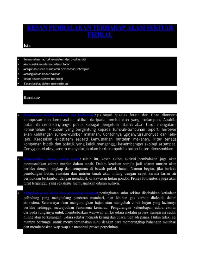 KESAN-KESAN PEMBALAKAN TERHADAP ALAM SEKITAR FIZIKAL Peningkatan suhu Penebangan hutan daripada aktiviti pembalakn menyebabkan peningkatan suhu.Hal ini disebabkan ketiadaan pelindung yang menghalang bahangan matahari dan lebihan gas karbon dioksida ...