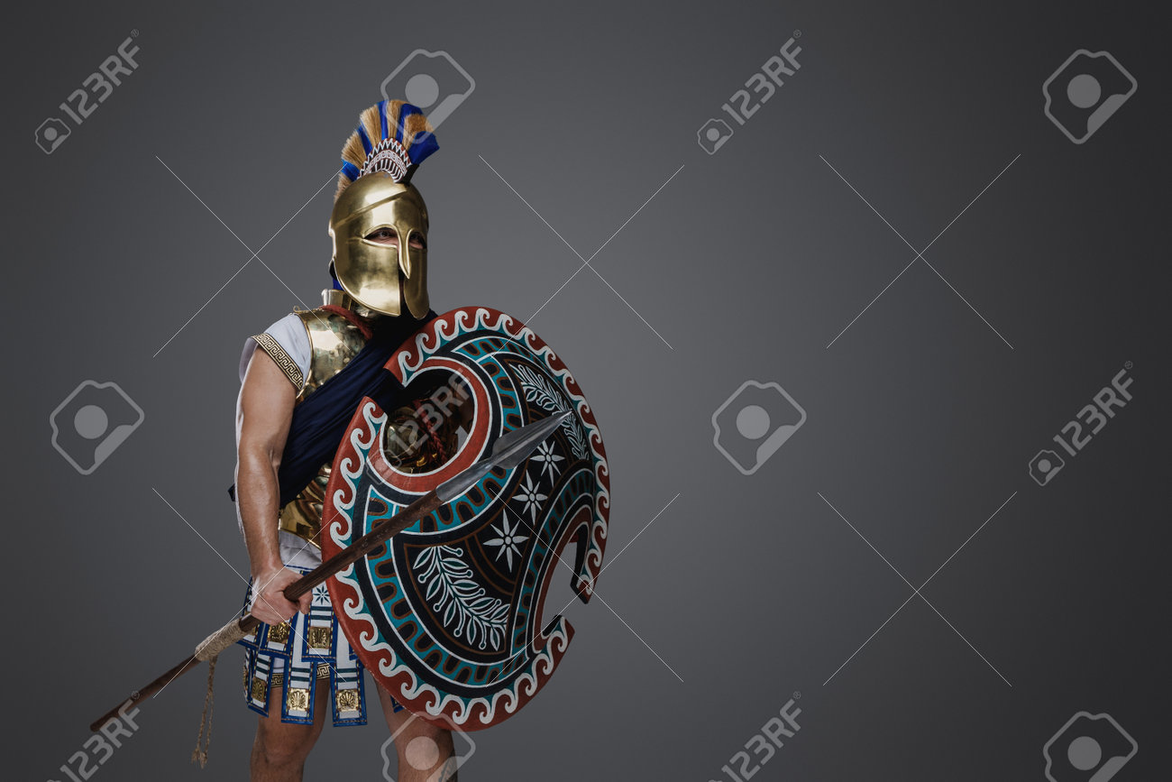 Lancero Furioso De La Grecia Antigua Contra El Fondo Gris Fotos ...
