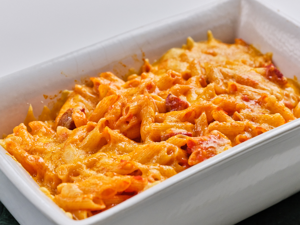 Macarrones con tomate suave y salchichas rojas al horno - Recetas ...