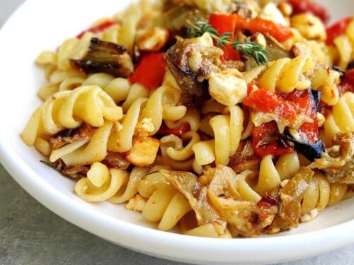 Pasta con tomates asados y queso feta