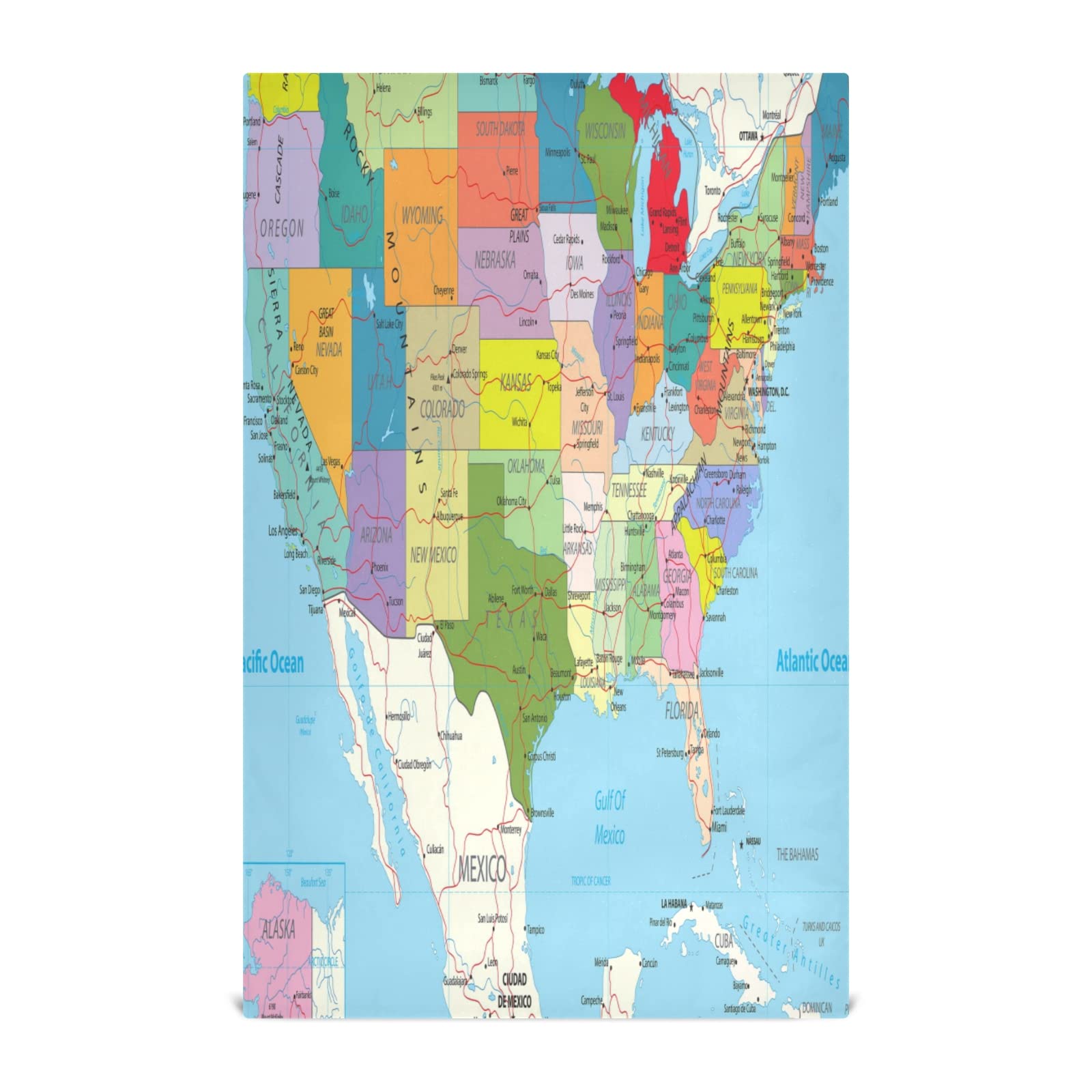 Colorido mapa de ruta político de Estados Unidos con carreteras, objetos de agua y ciudades de 80 x 60 pulgadas, tapiz de pared colgante vertical, ...