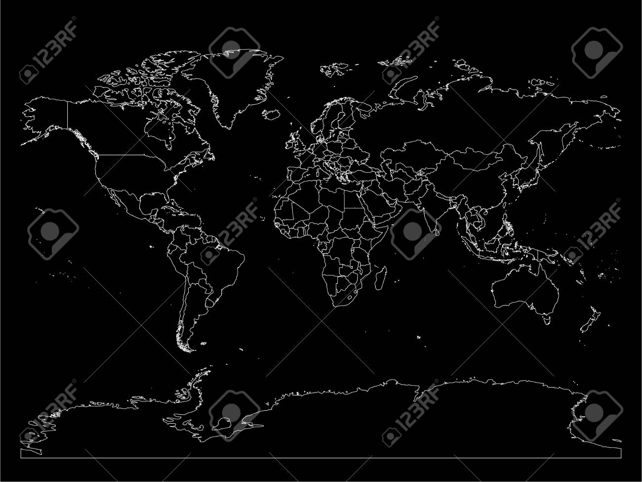 Mapa Do Mundo Com As Fronteiras Do País, Contorno Branco Fino No Fundo Preto. Linha De Detalhe Simples Alta Wireframe Vector. Ilustraciones svg, vectoriales, clip art vectorizado libre de derechos. Image 91126003