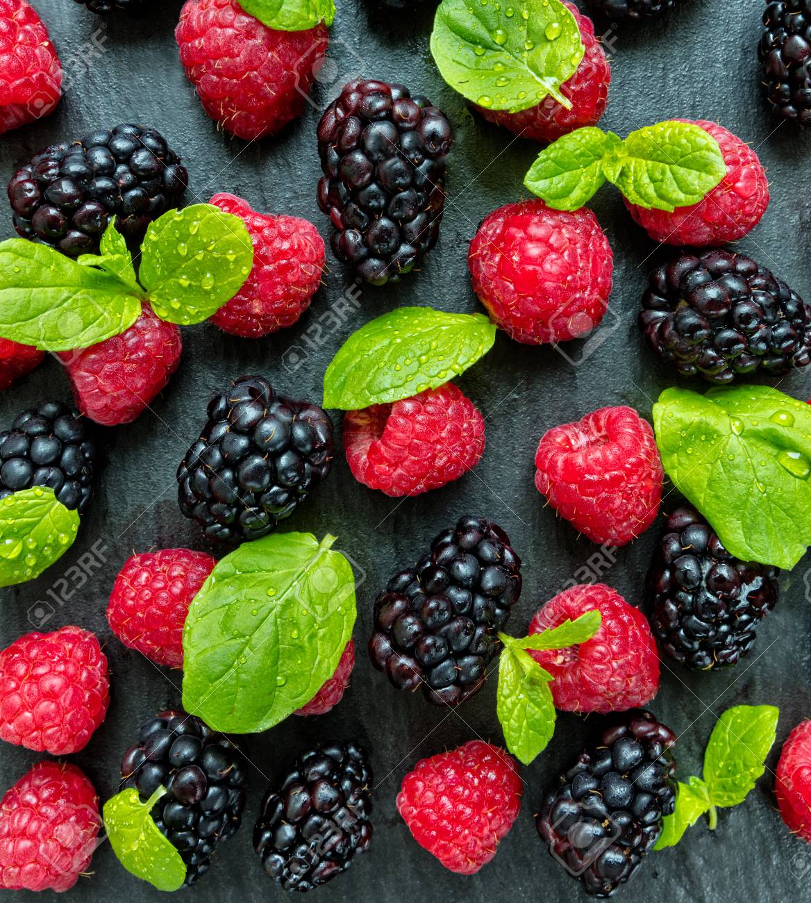 Montón De Frambuesa Y Mora Colocada En Piedra Negra, Disparó Desde ...
