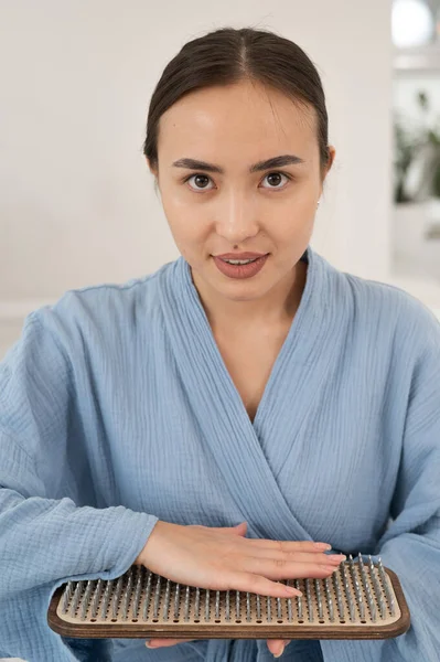 Mujer de pie sobre el tablero Sadhu Tablero yóguico de clavos con ...