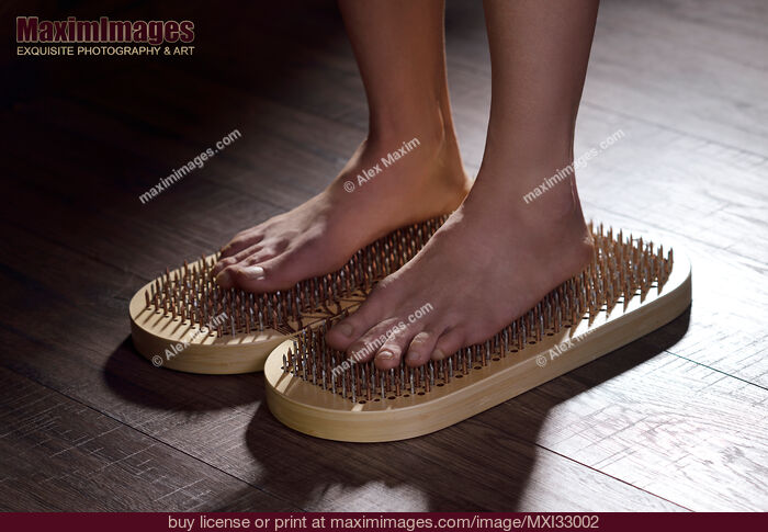 Los Pies De Las Mujeres Están De Pie Sobre Una Tabla Con Clavos ...
