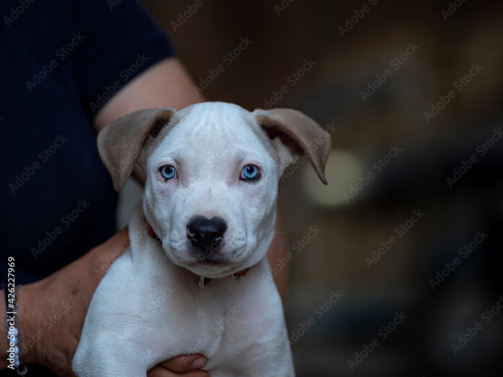 Cachorro Pitbull con ojos azules y pelaje blanco. Stock Photo ...