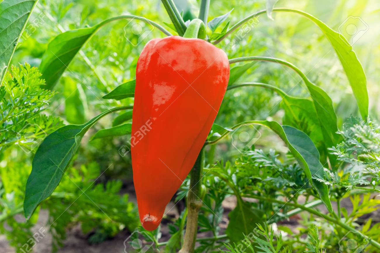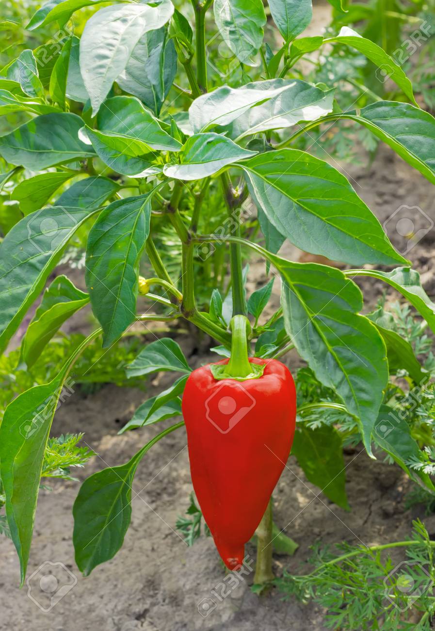 Planta De Pimientos Rojos Que Crece En El Jardín Imagen de archivo ...