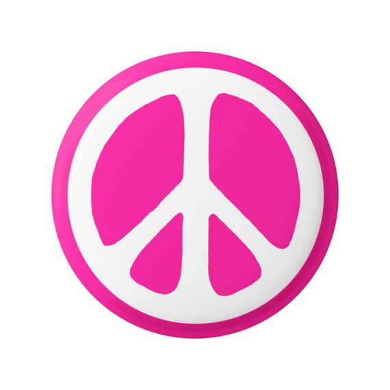 Signo de paz blanco sobre rosa caliente Hippie 60s Botón para mochilas, chaquetas, sombreros o refrigerador imán redondo 1.5 pulgadas