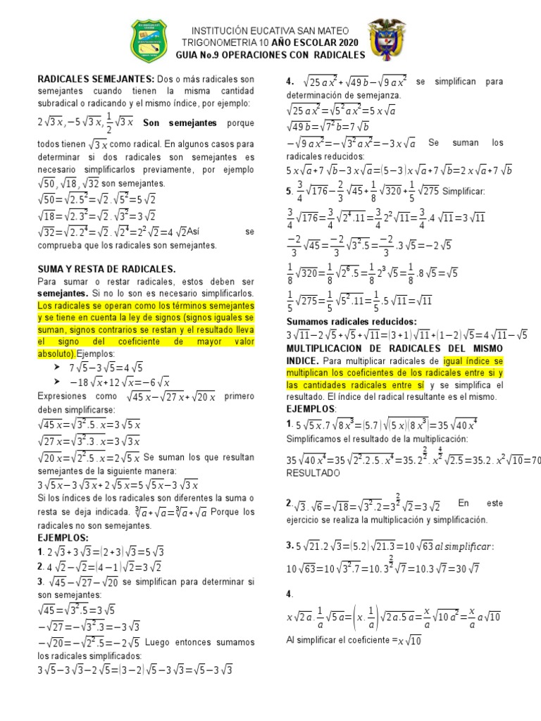 GUIA No.9 OPERACIONES CON RADICALES SEMEJANTES | PDF ...