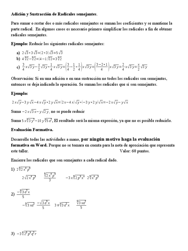 Adicción y Sustracción de Radicales Semejantes TAREA | PDF ...