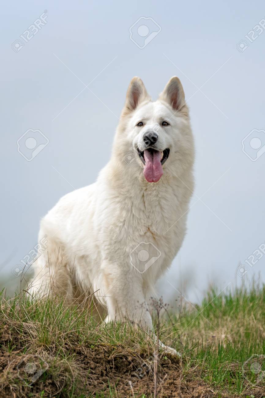 Un pastor suizo blanco disfrutando del Foto de stock ...