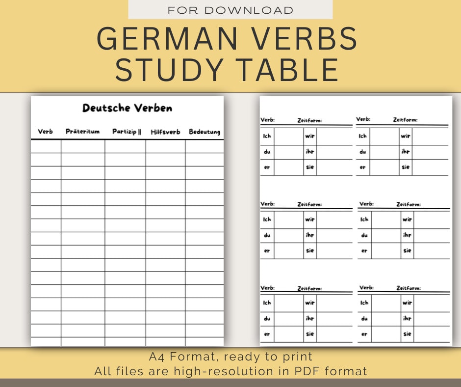 Práctica de tabla de verbos en alemán imprimible, plantilla de ...