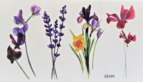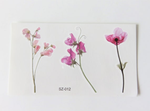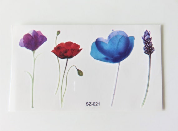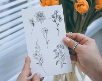Tatuajes temporales de flores de Alice Draws The Line; adórnate con ilustraciones; no me olvides, tatuaje de amapola, prímula, tatuajes de guisantes ...