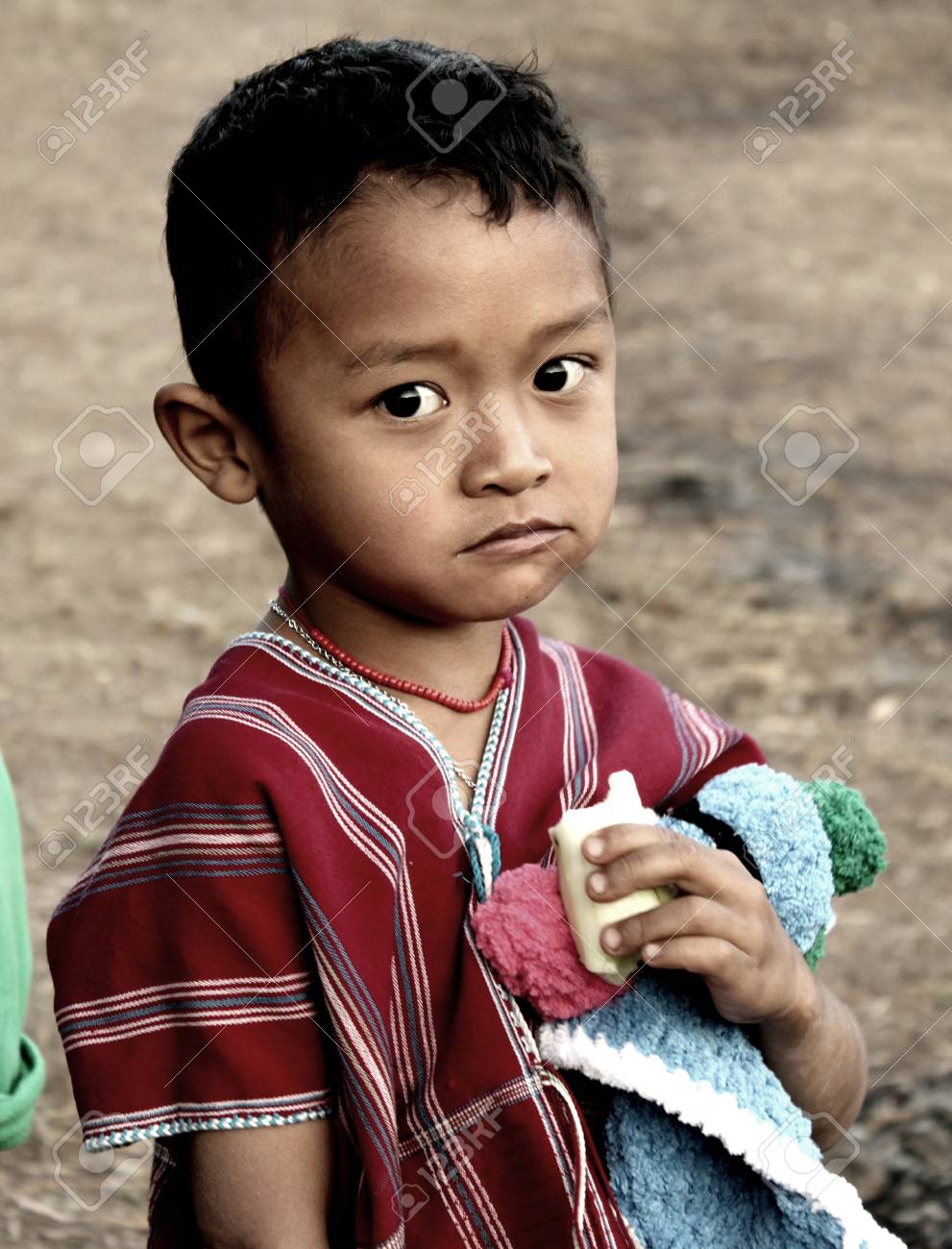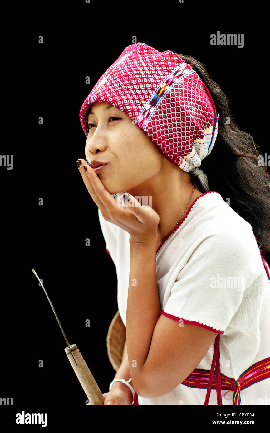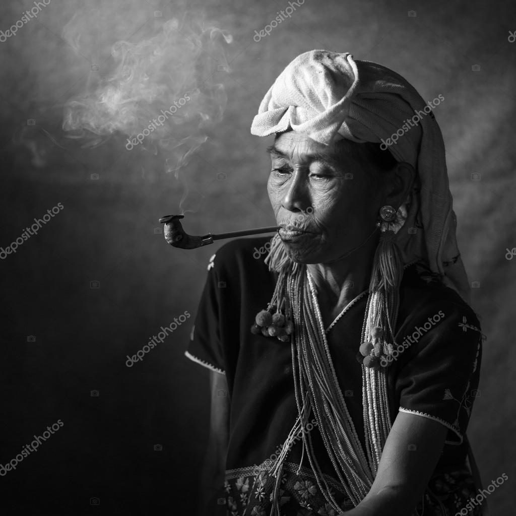 Karen Hill tribu está fumando pipa de tabaco con ropa tradicional ...